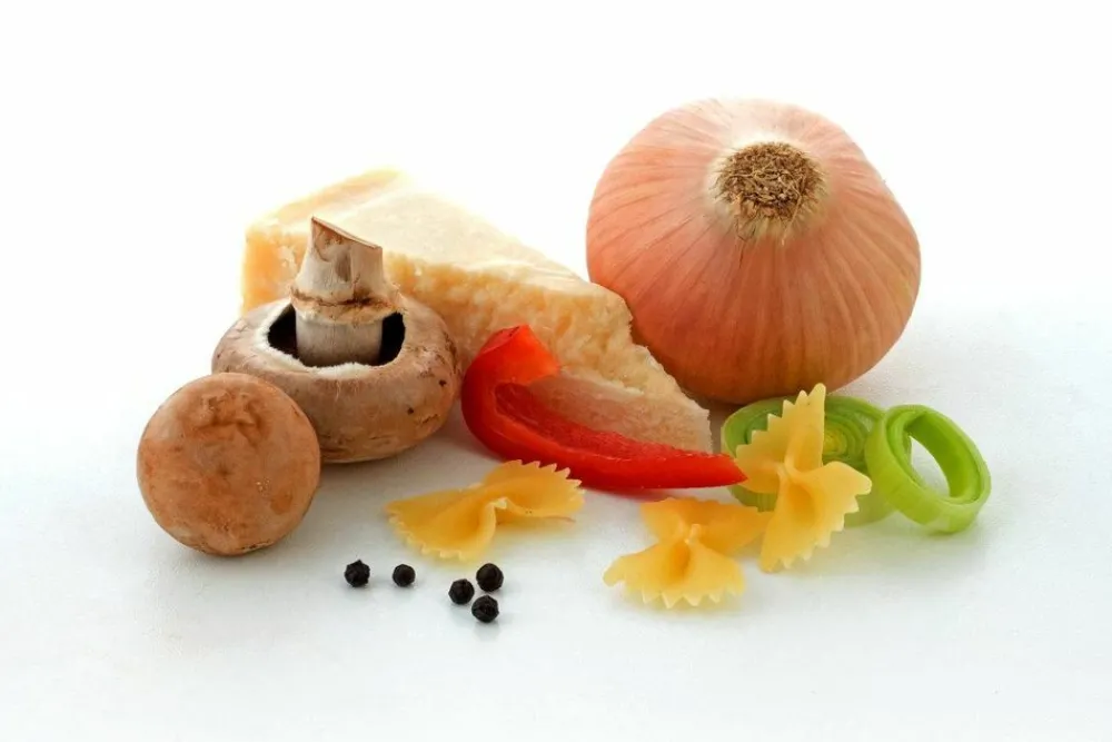 57% pasta (tarwe, ei, zout), 12% kaas (weipoeder, kaaspoeder, palmvet, zout, glucosestroop), palmvet, melkpoeder, kokosolie, aardappelzetmeel, 4% paprika, 2% prei, 2% ui, 2% champignon, zout, peper