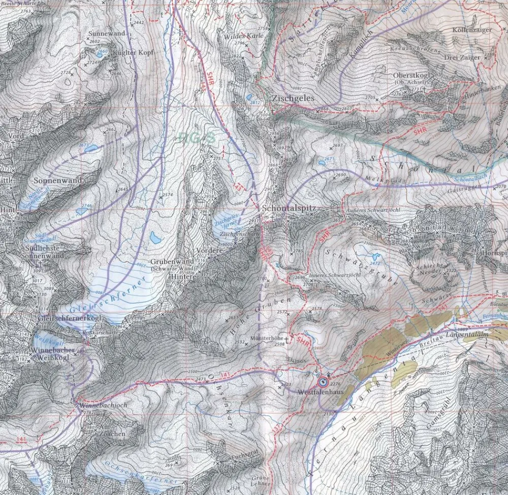 Plaatsen en bergtoppen op de kaart: Lüsens, Ruderhofspitze, Schrankugel.