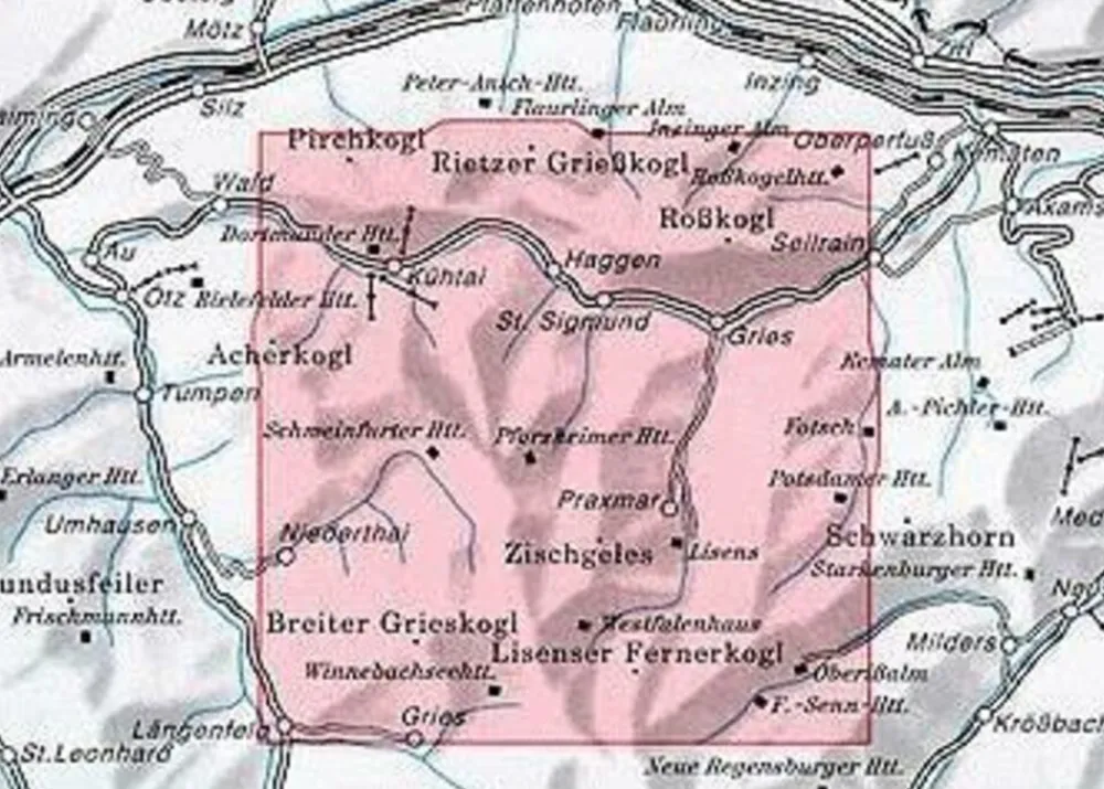 Plaatsen en bergtoppen op de kaart: Sellrain, Pirchkogl, Breiter Grieskogl, Gries.