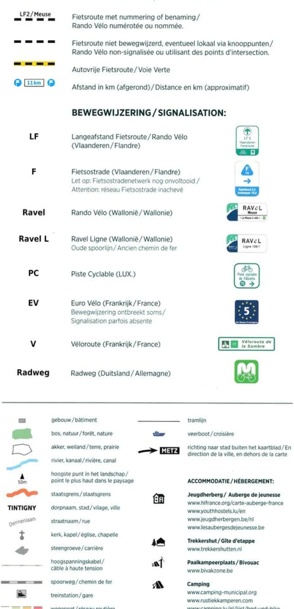 -ingetekende fietsroutes (Rando Vélo) met nummering of benaming (de RaVel routes)