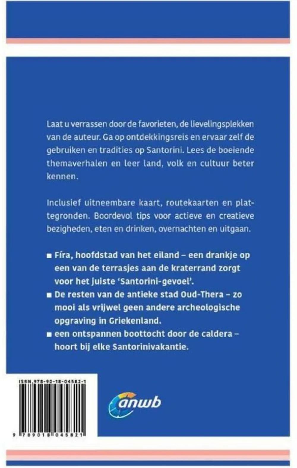 Verken Santorini op een andere manier met de uitgebreide ANWB Ontdek reisgids Santorini! Natuurlijk mag je bezienswaardigheden zoals de ruïnes van Oud-Thera en de witte huisjes met blauwe koepeldaken niet missen. Maar ga ook eens van de gebaande paden en beklim de terrassen bij de kraterrand van Fira´ of doe een dagje wellness bij Caldera Massages op de vulkaan. Deze reisgids biedt naast praktische tips over routes, hotels en vervoer ook originele ontdekkingstochten over het eiland. De auteur laat juist díe plekjes zien waar de andere toeristen aan voorbij lopen. Achter in de handzame gids zit een uitneembare kaart. Kortom: deze reisgids is een onmisbare reisgezel tijdens je vakantie op Santorini!