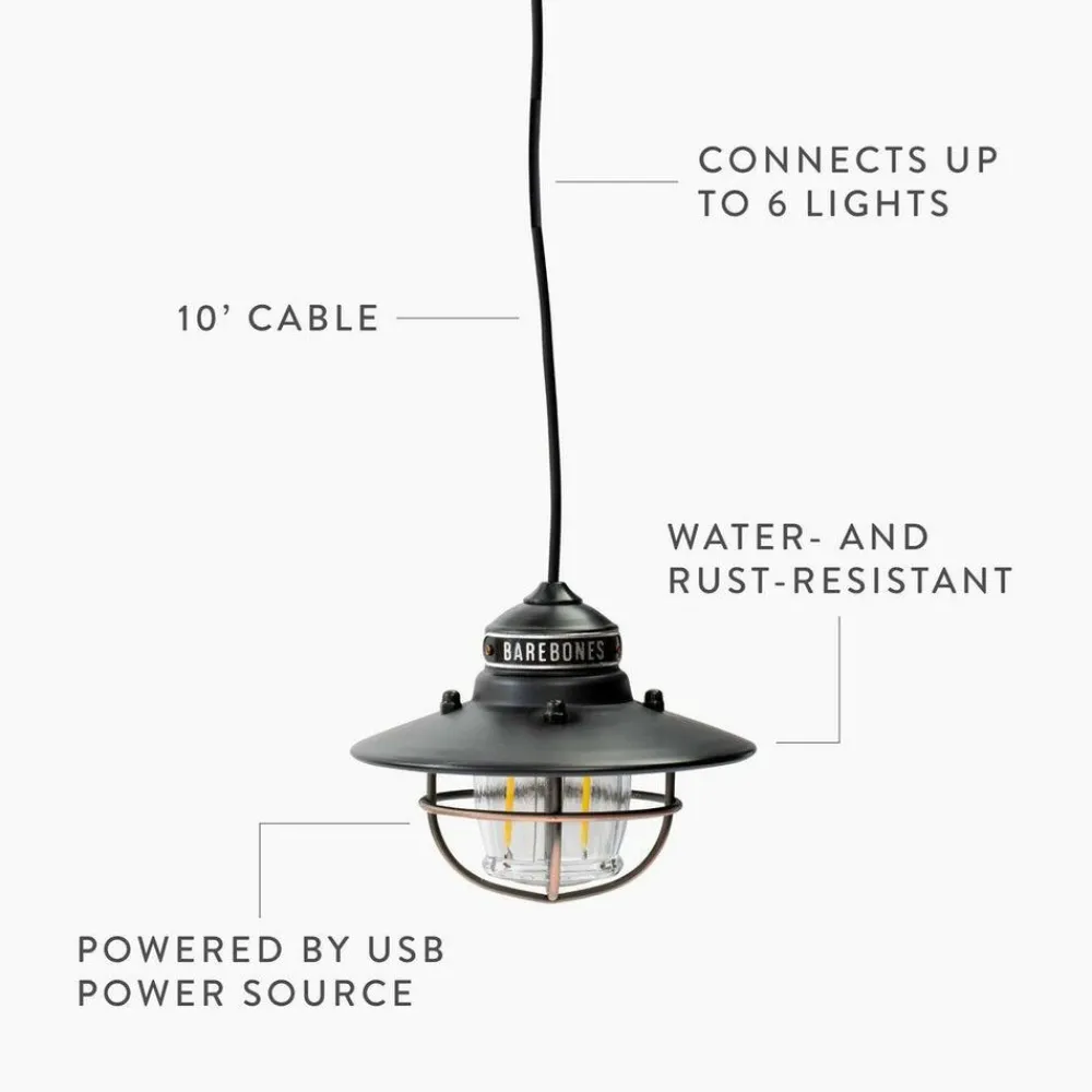 De Edison hanglamp van Barebones is water- en roestbestendig en gevoed door een draagbare USB-oplader, de LED Edison Hanglamp is ideaal voor op de camping, in de tuin of op de boot.