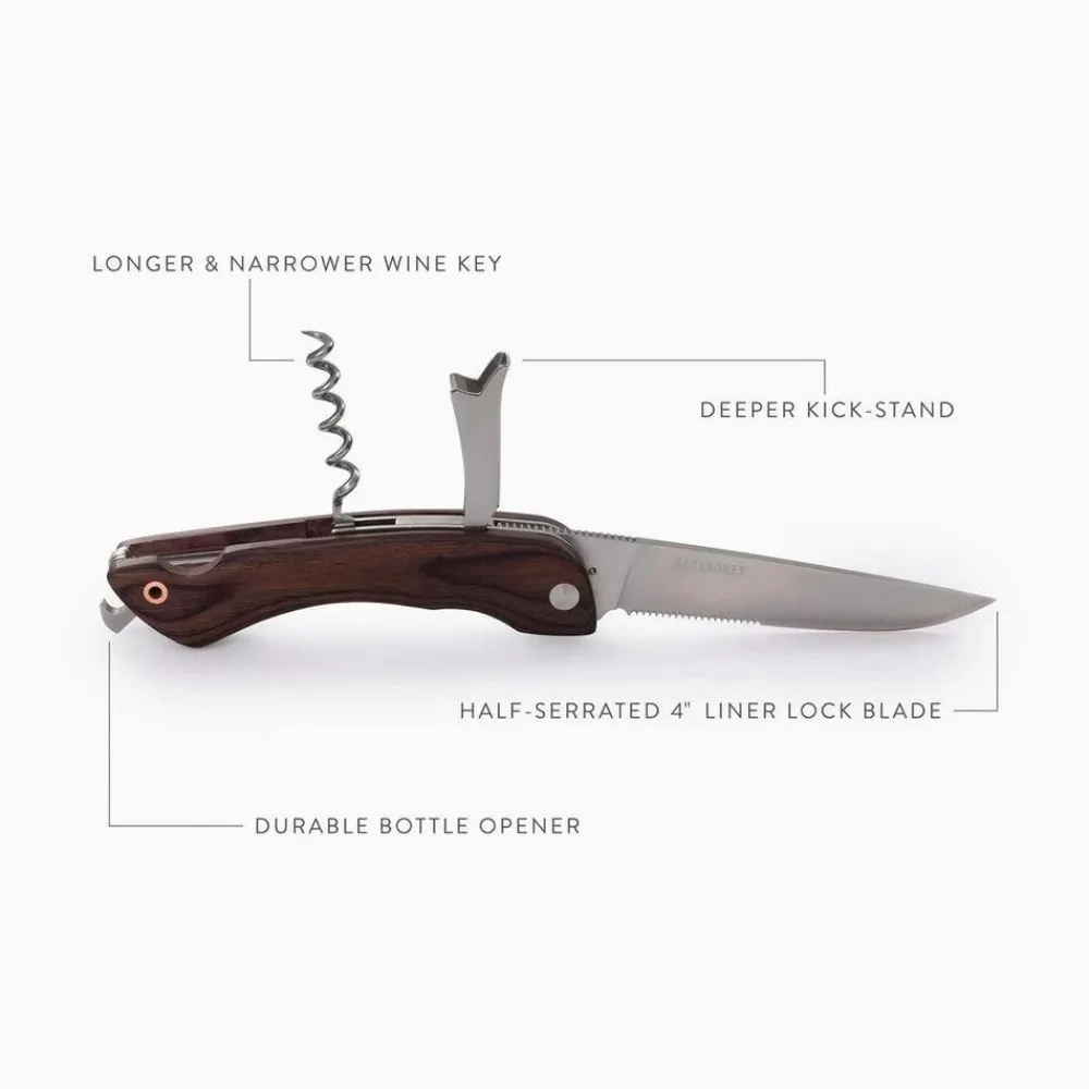 Een unieke combinatie van functionaliteit en draagbaarheid, de Provisions Corkscrew Knife van Barebones beschikt over een 4-inch half-gekarteld lemmet, een kurkentrekker en een flesopener. Snijd brood, vlees en kazen. Open een fles wijn of bier en berg het mes op.