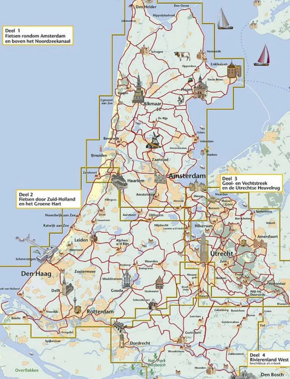 Voor ieder die vanaf de duinen tussen Zandvoort en Hoek van Holland het achterland wil verkennen met de bloeiende tulpen in de Bollenstreek, het Groene Hart met zijn talloze dijkjes, molens, plassen, waar de grond weliswaar per liter wordt verkocht maar waar de Hollanders hun bestaan op het water hebben veroverd en daar de mooiste steden en stadjes als Gouda en Oudewater hebben laten verrijzen. Hier fiets je langs stroompjes en rivieren waaraan zoals bij de Vecht de rijke buitenplaatsen ontstonden.