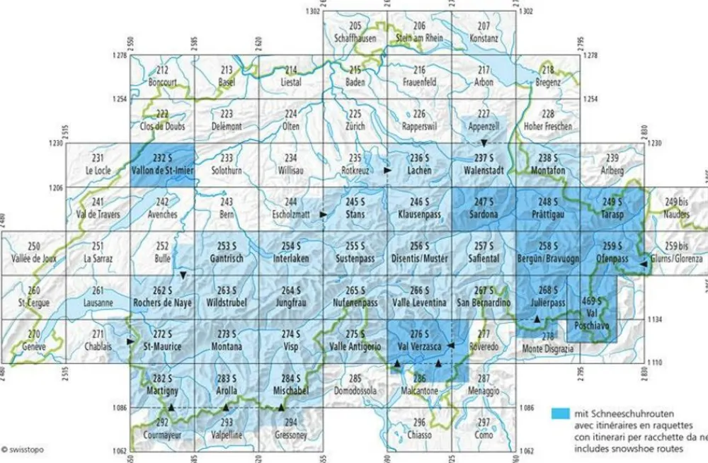 Topografische wintersportkaart 265s Nufenenpass met sneeuwschoen-, ski- en snowboardroutes: betreft regio rondom Goms – Bedretto – Basodino. Op de grens van Wallis en Ticino.