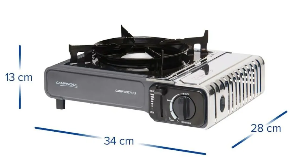 De laatste versie van het succesverhaal van Campingaz, de Camp’Bistro 3, met 2 geïntegreerde veiligheidssystemen, een roestvrijstalen cartouche en een verbeterde pandrager, die voor stabiliteit en een veilig gebruik van het kooktoestel zorgen. Dit stevige gasstel wordt geleverd met zijn eigen draagtas van hard plastic, voor gemakkelijk vervoer en opslag.
