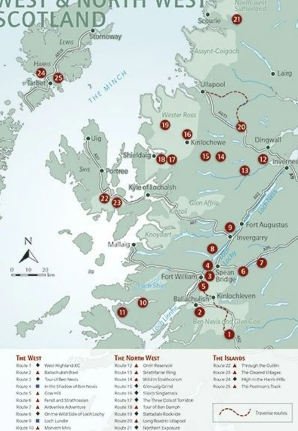 This guidebook to mountain biking routes in North and North West Scotland describes 25 MTB routes north of the Great Glen, Covering a large geographical area,including Fort William, Rannoch Moor, Glen Spean, Ben Nevis, Sutherland, Torridon and Skye, the routes give a real flavour of the variety of different bike riding available. The routes range from 19.5km to 73.25km, graded moderate to very hard. Many are long and committing, so good preparation and fitness are essential, and in some cases a willingness to “hike and bike”.