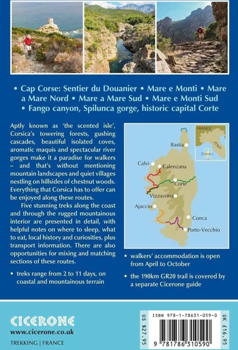 With spectacular mountain landscapes, beautiful rugged coast, forests, maquis and striking river gorges, Corsica is a walker’s paradise. This guidebook details five of the islands’s most popular shorter treks: the 2-day coastal Sentier du Douanier (Customs Officer’s Path) around Cap Corse; two coast-to-coast routes through the central mountains, the 11-day Mare a Mare Nord and the 5-day Mare a Mare Sud; and two ‘coast and mountains’ routes, the 10-day Mare e Monti and the 5-day Mare e Monti Sud. (Corsica’s famous 190km GR20 trail is described in a separate Cicerone guide.) The routes can be linked to create longer excursions and accommodation is provided by a mixture of walkers’ hostels, B&Bs and hotels; camping is also an option.