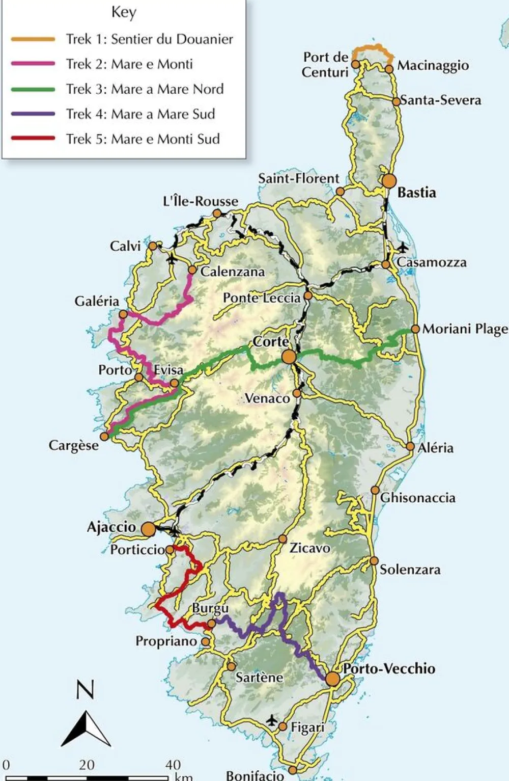 Guidebook describing five mountain and coastal treks on the Mediterranean island of Corsica: the 2-day Sentier du Douanier (Custom Officer’s Path), the 10-day Mare e Monti, the 11-day coast-to-coast Mare a Mare Nord, the 5-day Mare a Mare Sud and the 5-day Mare e Monti Sud. With information on facilities and local plants and wildlife.
