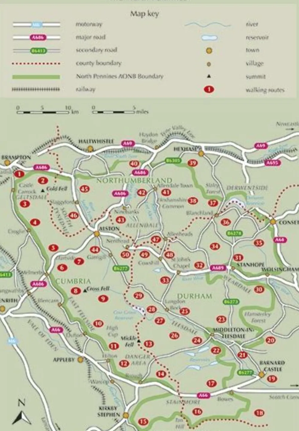 Goede wandelgids met 50 wandelingen in de North Pennines. Met overzichtkaartjes, praktische informatie over wandelingen, openbaar vervoer en eten en drinkmogelijkheden.