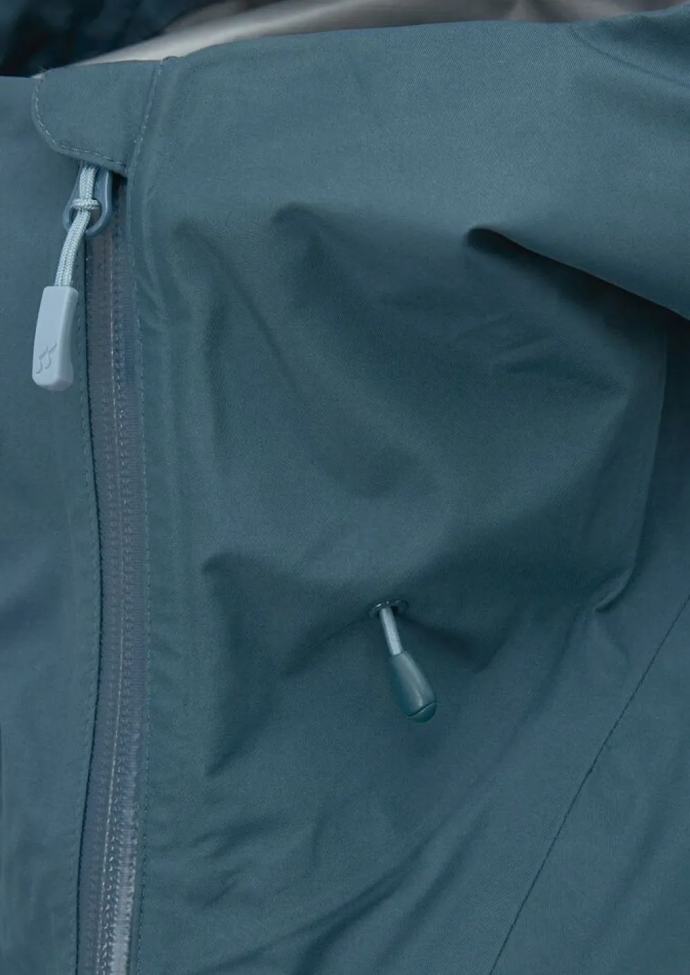 De jas is ontworpen voor uitzonderlijk comfort op de berg, met ventilatieopeningen onder de armen waardoor je warmte kunt afvoeren, en een met fleece gevoerde kinbescherming voor als je het weer buiten houdt op een stormachtige bergkam. De in twee richtingen verstelbare capuchon kan met één handbeweging worden vastgemaakt en zorgt ervoor dat het hoofd gemakkelijk gedraaid kan worden met een onbelemmerd gezichtsveld. De capuchon heeft een verstevigde klep, die je gezicht helpt beschermen tegen regen. De met klittenband verstelbare manchetten sluiten naadloos aan bij handschoenen, en er zijn twee handzakken voor het verwarmen van gevoelloze vingers op de koudste dagen.