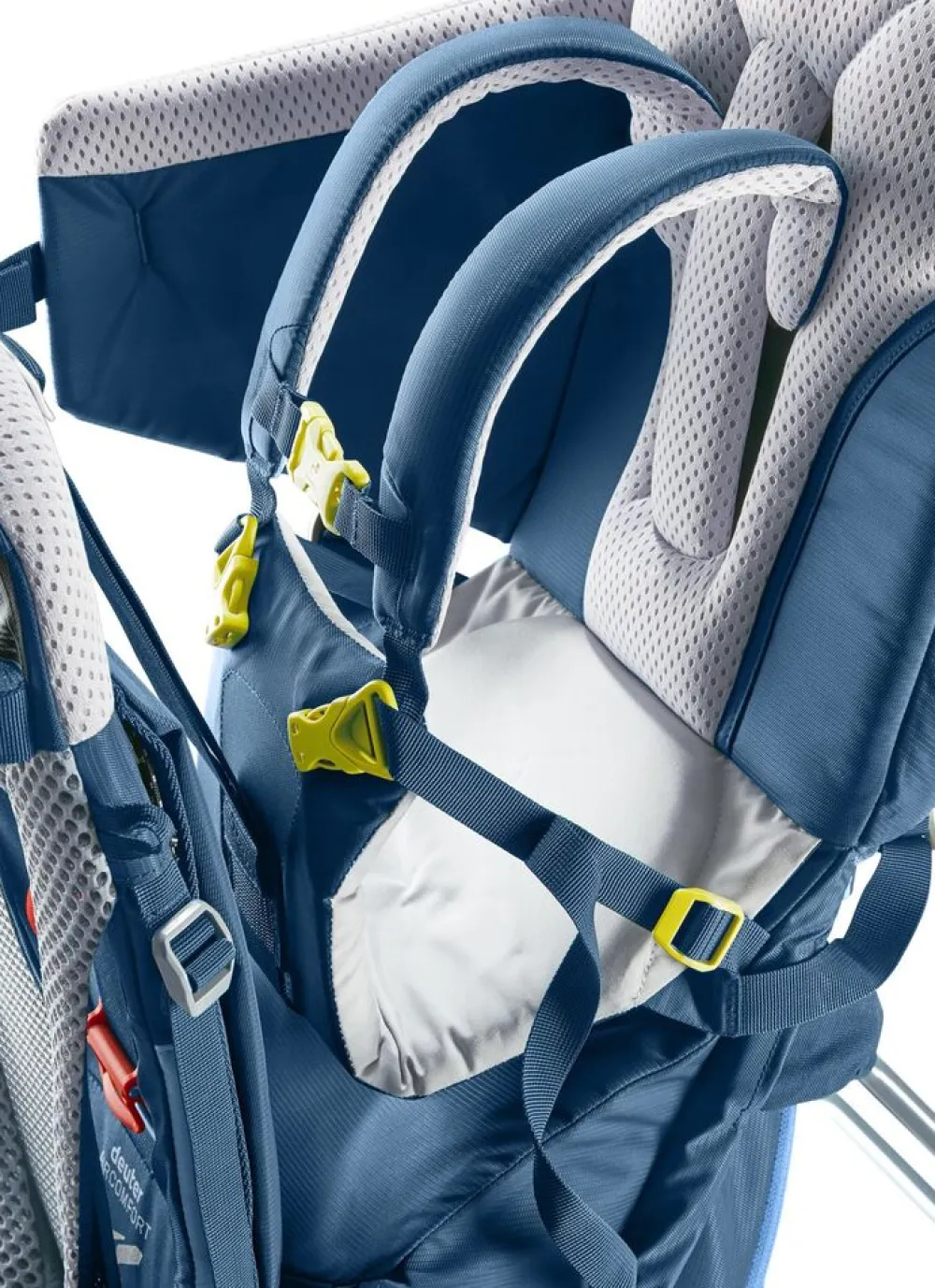 De Kid Comfort van Deuter is voorzien van het prettige Aircomfort Sensic Vario draagsysteem, waarmee bergavonturen voor gezinnen duidelijk aangenamer worden. De schouderbanden zijn verstelbaar zodat de drager door beide partners gedragen kan worden (mits deze niet teveel verschillen qua lengte). Het kind is makkelijk in de drager te zetten door de zijwaartse instap. Daarnaast is het kussen bij de kin makkelijk vervangbaar en wasbaar. De kinderdrager is goedgekeurd door het TÜV GS veilingheidslabel.