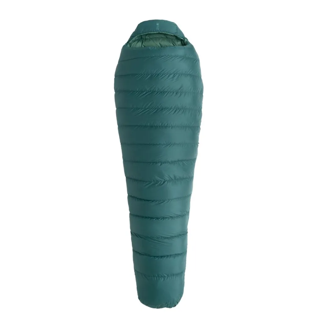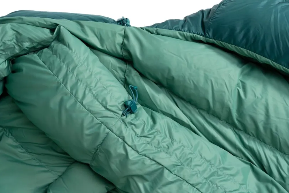 De buiten- en binnenmaterialen zijn gemaakt van gerecyclede stoffen en de vulling is uitsluitend RDS-gecertificeerd dons. De slaapzakken worden in Europa gevuld. Een waterdichte zak en een praktische opbergzak zijn bij de levering inbegrepen.