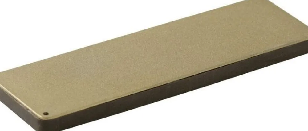 Tafelmodel slijpsteen. De gele kant is grof en gemaakt van diamand. Met deze kant kunt u elk mes werkbaar scherp krijgen. De grijze kant is keramisch en wordt gebruikt om het mes vlijmscherp te krijgen. Ideaal voor koksmessen, tools e.d.