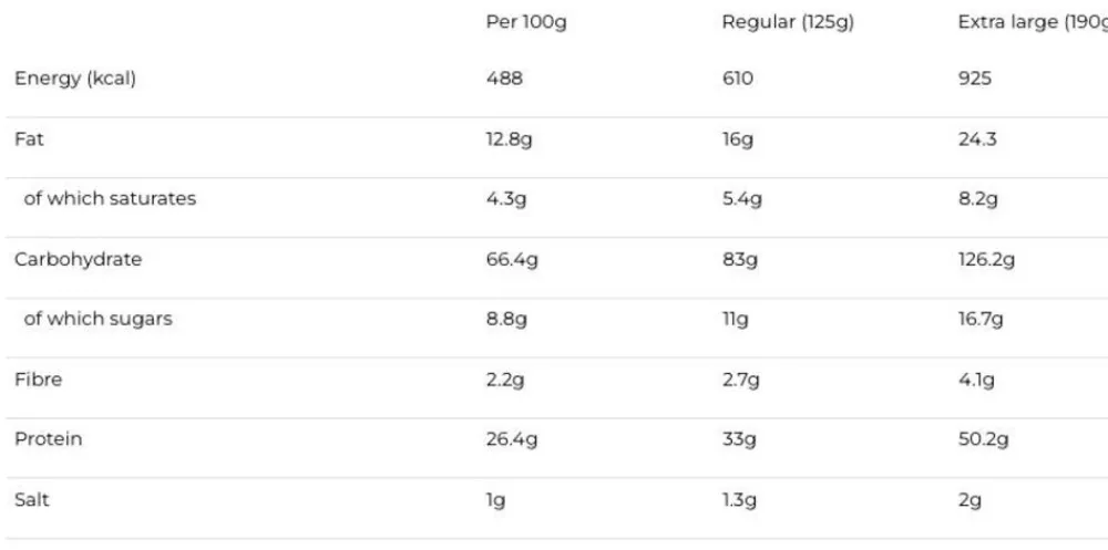 - Calorieën: 610kcal (regular) / 925kcal (extra-large)