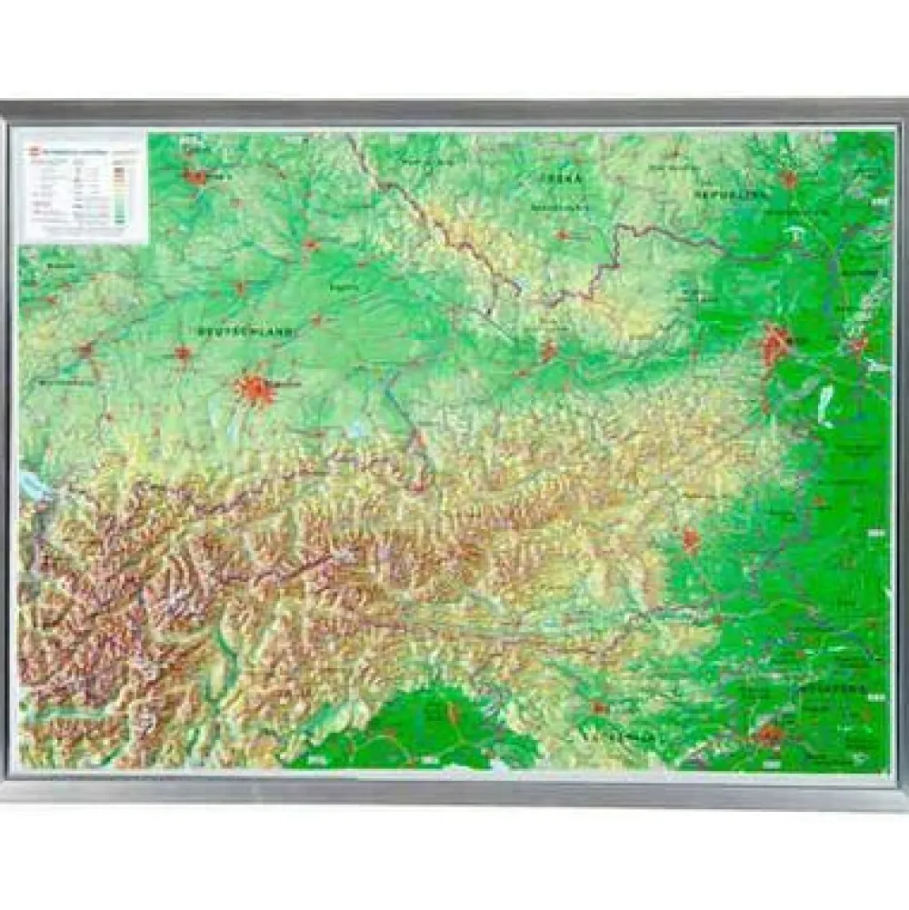 Prachtige reliëfkaart van Oostenrijk. Prettig kleurgebruik en met voelbaar reliëf. Wordt ook geleverd in een variant zonder lijst.