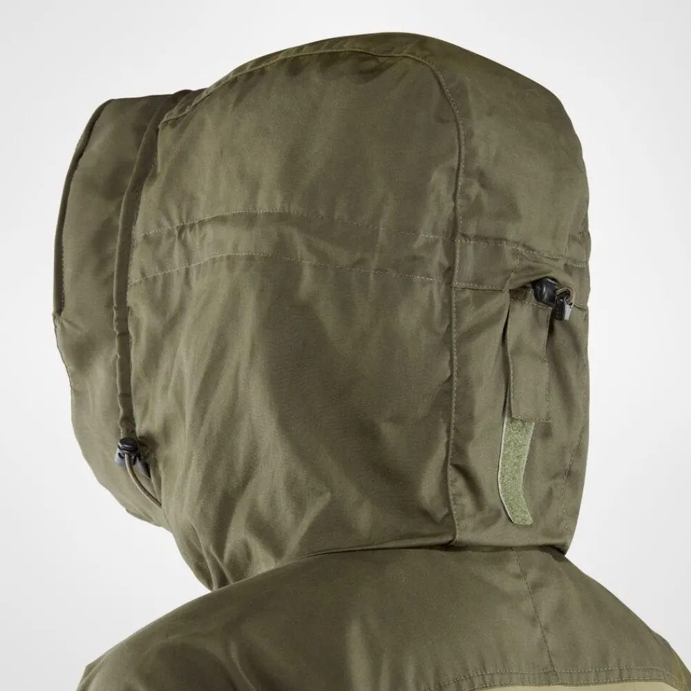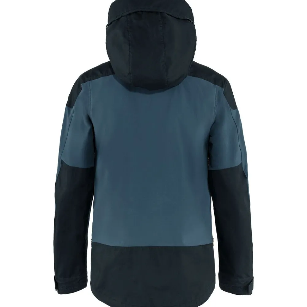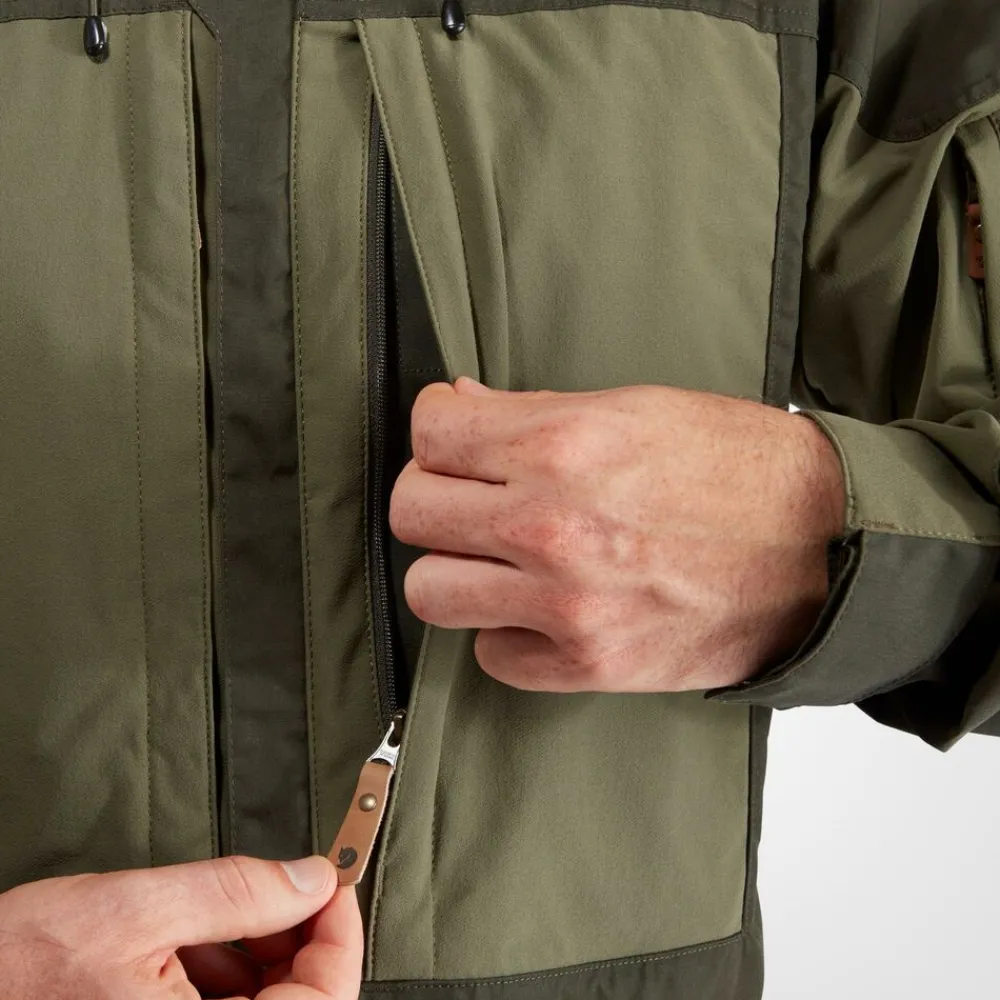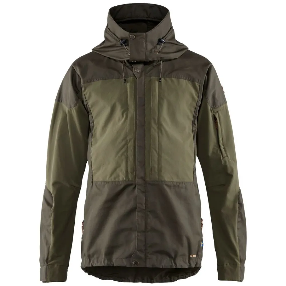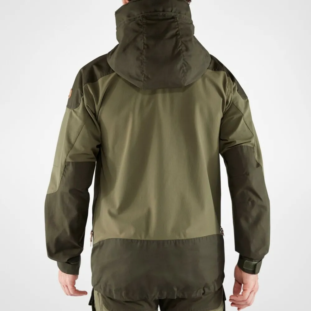 Het Keb Jacket M van Fjällräven is een technische outdoorjas, waarbij bewegingsvrijheid en ademend vermogen minstens zo belangrijk is als slijtvastheid. Dit wordt bereikt door een combinatie van wind- en waterafstotend G-1000® Eco van gerecycled polyester en ecologisch katoen op de capuchon, schouders, voorzijde en het verlengde rugpand en stretch in het rugpand, de mouwen en zakken.