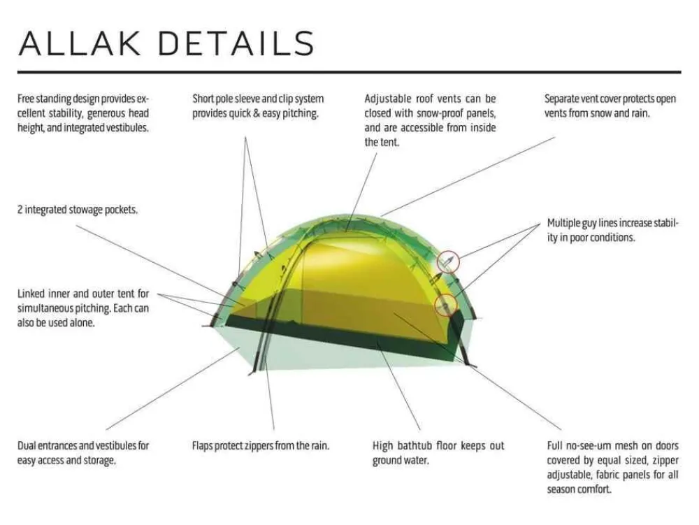 De Hilleberg Allak is een op zichzelfstaande tent. In deze dwarsslaper zitten twee ingangen met een kleine luifelruimte. De deuren van de binnentent zijn erg groot en hoog voor een ruime instap. Het dakje van de buitentent is los te koppelen voor een optimale ventilatie. In het dak van de buitentent zitten twee ritsen om te ventileren als het losse dakje erop zit. Let op: met de komst van het driepersoons model Allak 3, heeft de “oude” Allak” nu als naam “Allak 2“