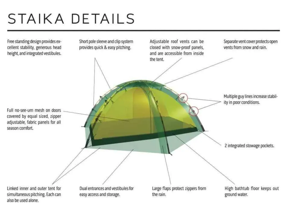 Het materiaal van de buitentent is zeer sterk, maar toch licht, en volledig bestand tegen een dik pak sneeuw. De Hilleberg Staika kan het hele jaar door gebruikt worden in alle weersomstandigheden. De tent is voorzien van twee deuren die elk met een extra rits van boven open te zetten zijn. Daarnaast zijn deze deuren voorzien van gaas. In de bovenkant van de binnen- en buitentent zitten verstelbare ventilatie vensters. Een extra kapje op de buitentent biedt bescherming tegen sneeuw en regen. De binnentent is voorzien van hoog opstaande randen om grondwater buiten te houden.