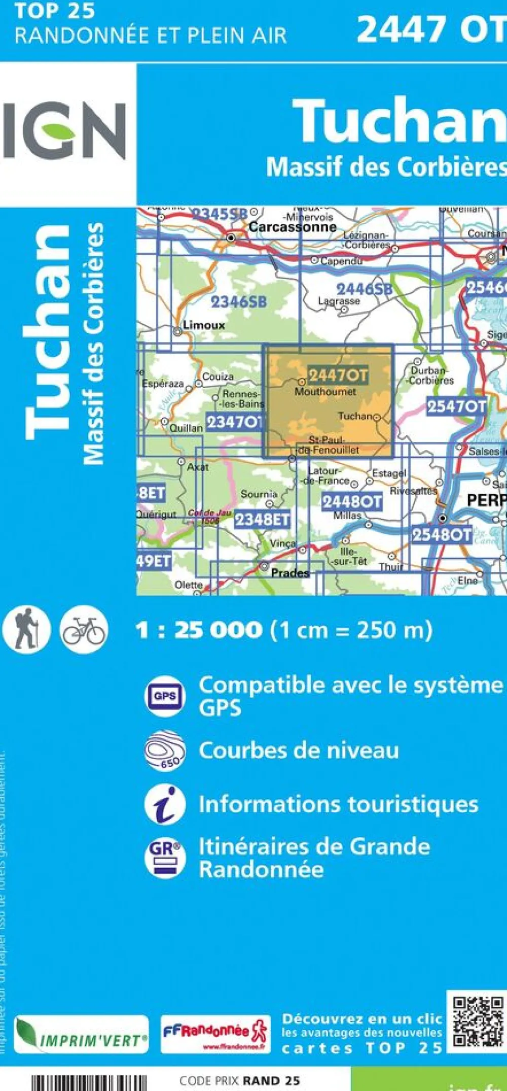 L’indispensable carte de randonnée IGN 2447OT. D’une très grande précision elle contient tous les détails existants sur le terrain : voies de communication jusqu’au moindre sentier, constructions jusqu’au hangar, bois, arbre isolé, rivière, source… Sans oublier la représentation du relief par des courbes de niveau. Les sentiers balisés et les informations touristiques sont également représentées.