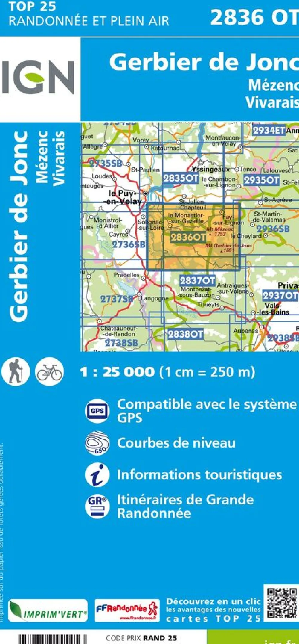 L’indispensable carte de randonnée IGN 2836OT. D’une très grande précision elle contient tous les détails existants sur le terrain : voies de communication jusqu’au moindre sentier, constructions jusqu’au hangar, bois, arbre isolé, rivière, source… Sans oublier la représentation du relief par des courbes de niveau. Les sentiers balisés et les informations touristiques sont également représentées.