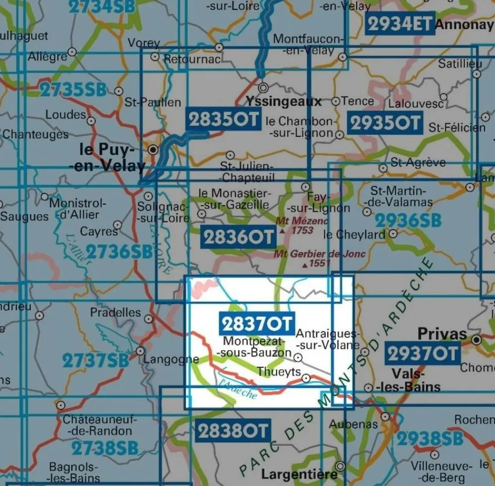 De IGN 2837OT wandelkaart. Is een zeer nauwkeurige kaart, deze bevat elk detail van het terrein: van hoofdwegen tot aan het kleinste voetpad, van gebouwen tot aan schuurtjes, bossen, geïsoleerde bomen, rivieren, bronnen, enz. En niet te vergeten de weergave van het reliëf door middel van hoogtelijnen. Bewegwijzerde wandelpaden en toeristische informatie worden ook weergegeven.