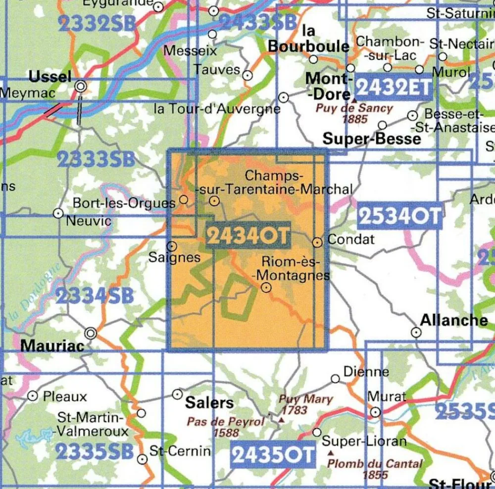 Uitstekende topografische wandelkaart nummer 2434ot Riom-ès-Montagnes, Auvergne, Bort-les-orgues