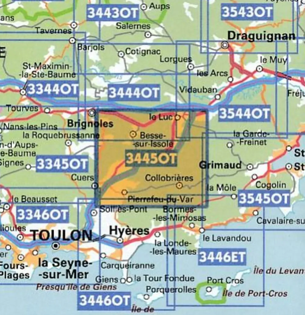 Uitstekende, topografische wandelkaart nummer 3445ot Cuers: ten noordoosten van Toulon.