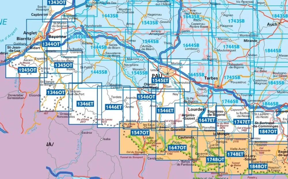 De rest van Frankrijk wordt in kaart gebracht met de “Série Bleu” (eindigend op O = ouest of E = est) welke geen speciale extra overdruk heeft om de wandelroutes aan te duiden. Op deze kaarten vind je dan ook geen toeristische informatie als campings en hutten; het zijn puur topografische kaarten, maar zoals gezegd bijzonder gedetailleerd. Elke “Série Bleu” kaart bedekt een gebied van ongeveer 20 x 14 km