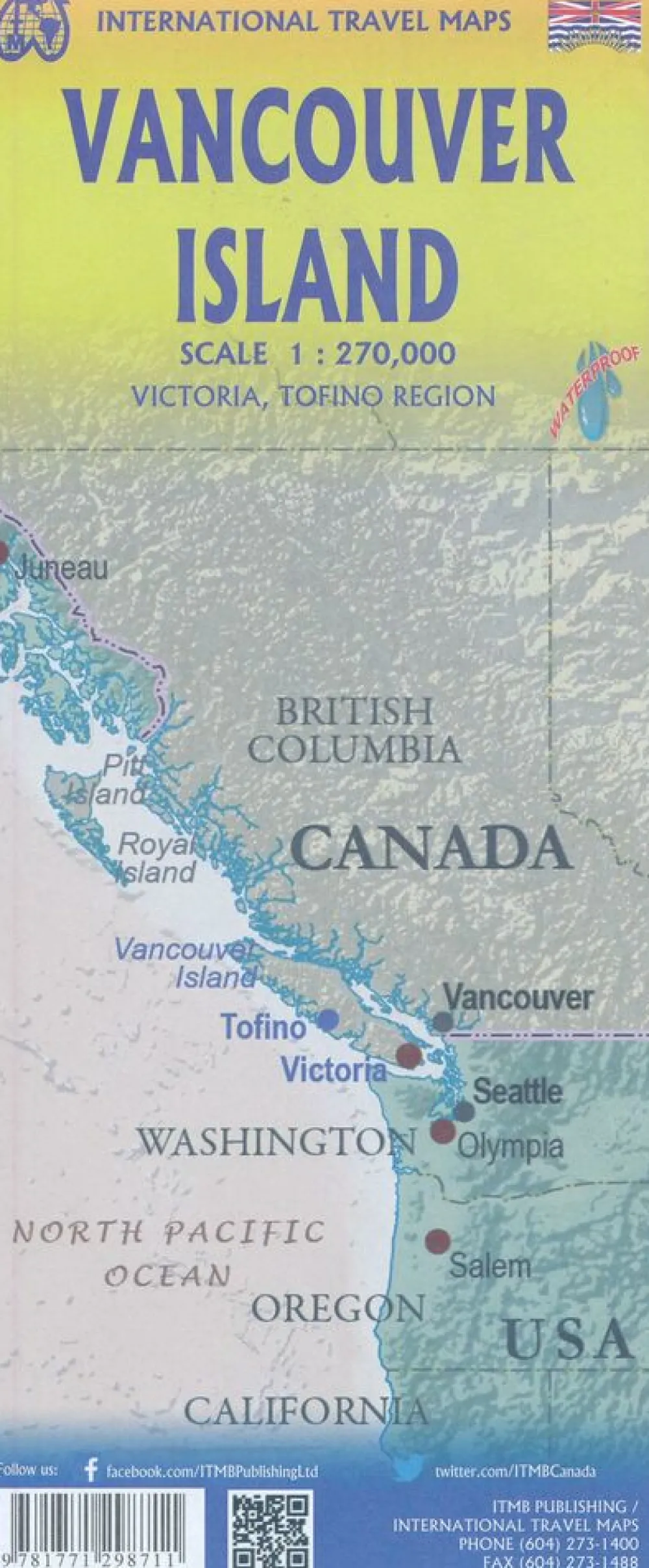 Folded road and travel map, in color. Scale 1:270,000. Distinguishes roads ranging from four lane highways to logging/dirt roads. Legend includes trails, ferry routes/terminals, railways, international/domestic airports, lighthouses, protected areas, military areas, glaciers, reefs/rock ledges, falls, rapids, campgrounds, points of interest, tourist information centres, museums, picnic grounds, fishing areas, canoeing/kayaking, hiking trails, golf courses, downhill skiing areas, rock climbing, beaches, hot springs, viewpoints, mines/abandoned mines. Includes inset map of Victoria. Indexed.