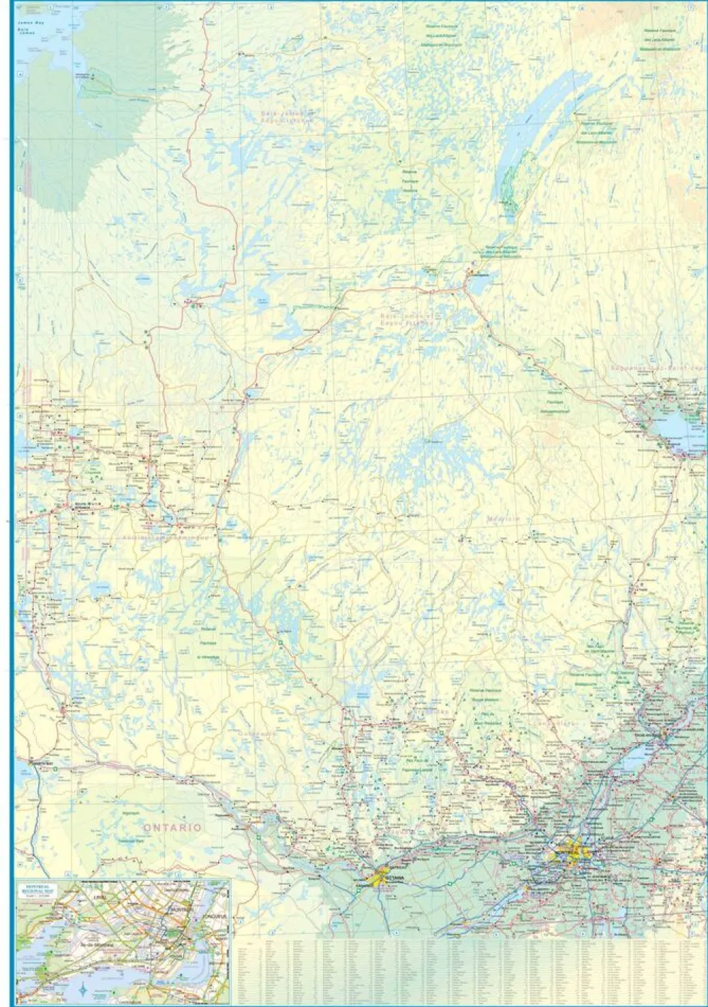 Engelstalige land/wegenkaart van het zuidelijk deel van Québec: met klein inzetkaartje van omgeving Montréal.
