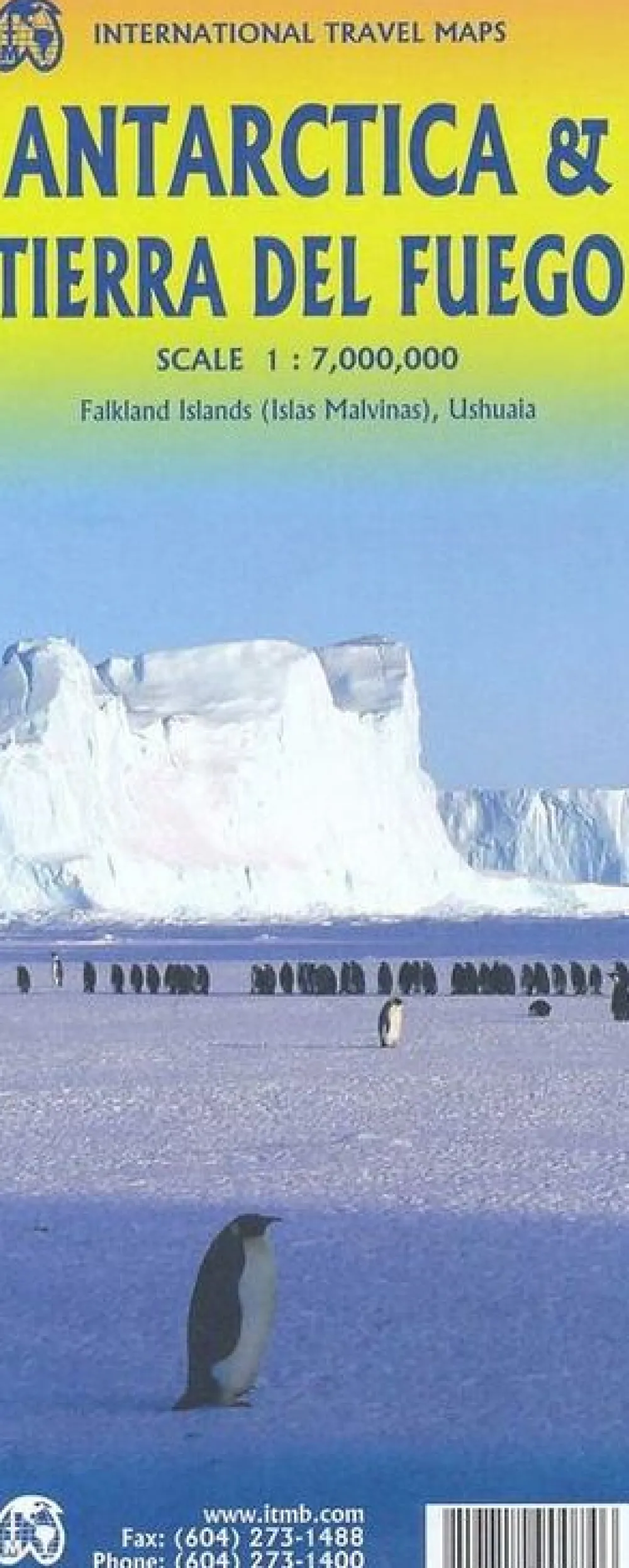 Goede overzichtskaart van Antarctica, schaal 1:7.000.000 met toeristische informatie en informatie over het klimaat en de natuur. Aan de andere zijde een kaart van Tierra del Fuego, schaal 1:750.000, de Falklandeilanden, schaal 1:1.100.000 en een plattegrond van Ushaia, schaal 1:10.00