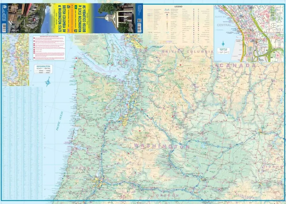 Wegenkaart van het zuidelijk gedeelte van de staat Washington in de Verenigde Staten en het zuidwesten van British Columbia in Canada. Een mooie overzichtskaart voor een rondreis door de Pacific Northwest.