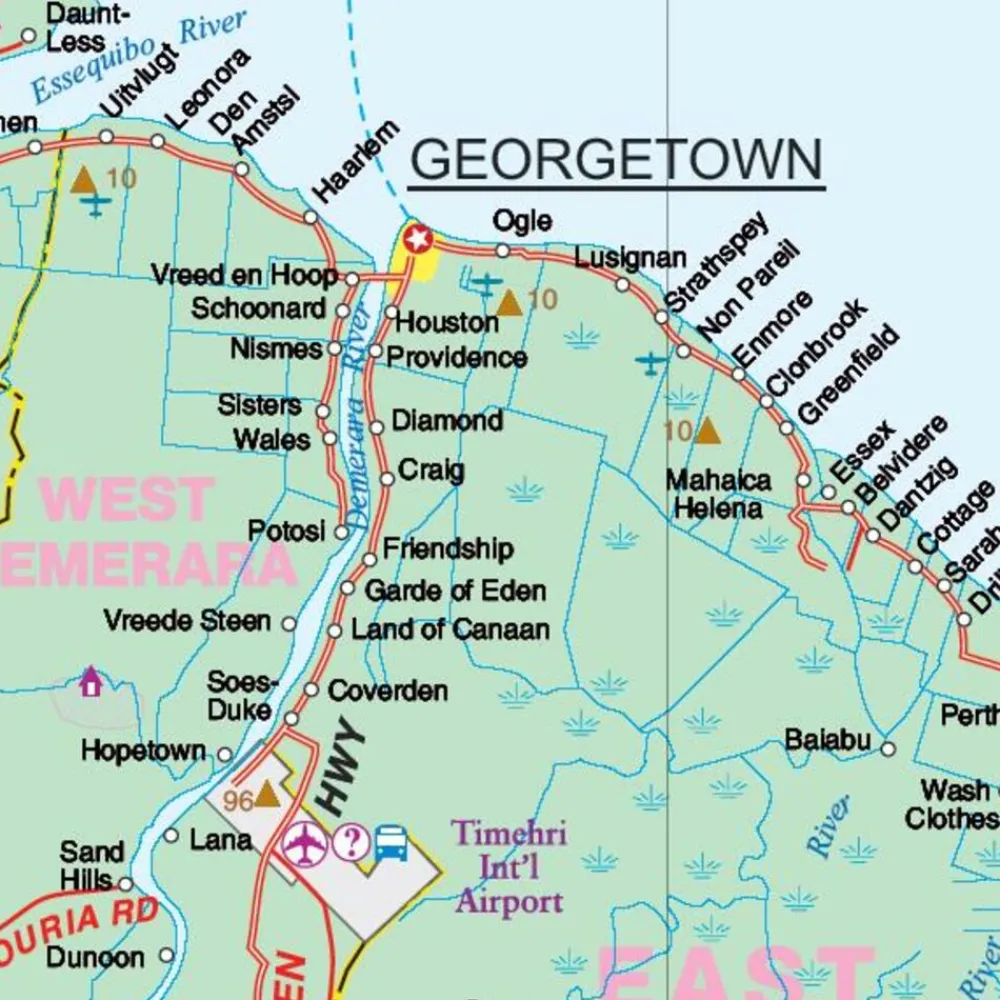 The focus of this map is on Guyana, reflecting the changes coming about as a result of the growing assertiveness of Brasil, which has repaved the highway north from Manaus on the Amazon to the border with Guyana (at Bomfin). The Guyanese are improving the road to Georgetown, shortening travel times for goods in both directions by weeks. This new bridge also enables travelers to pass north and south much more easily. We have also re-done the inset map of Georgetown to bring it up to date. We have also changed the regional map on the reverse side, which used to cover all three Guianas countries, and replaced it by one concentrating on the other two countries. The most significant change we’ve made is to re-name Surinam to the country’s preferred name of Suriname. As we made relatively few changes to the artwork, and as Suriname/French Guiana is a separate map in our South America Series, it will continue as a separate title.