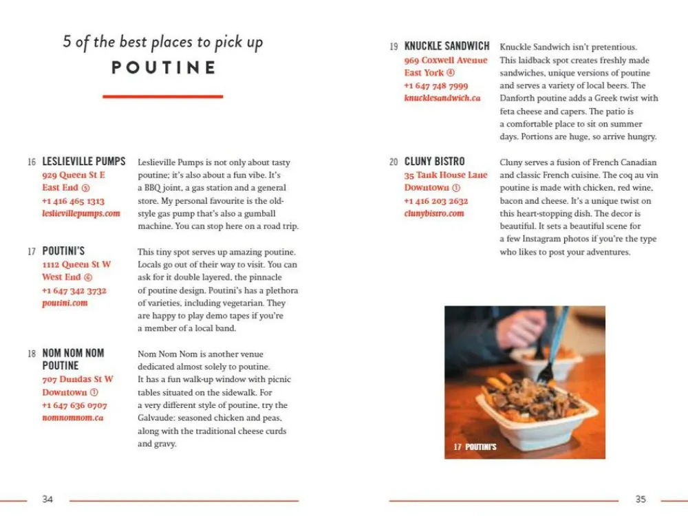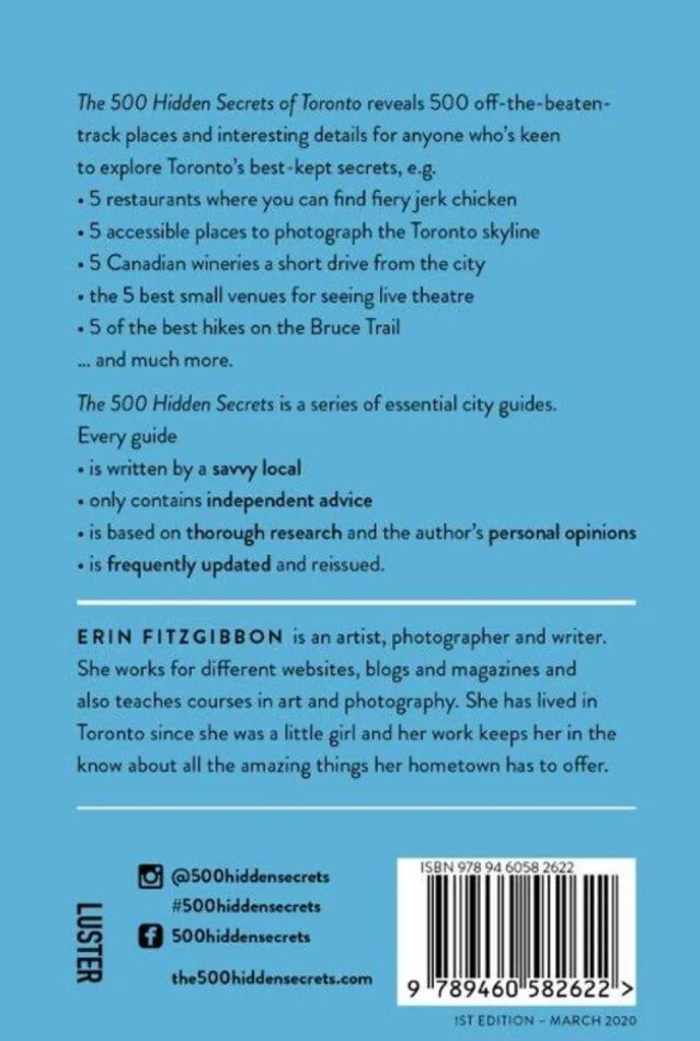 The 500 Hidden Secrets series hits Canada for the first time. Freelance writer, photographer and artist Erin FitzGibbon has lived in Toronto since she was a little girl and she knows every wonderful spot in town. With this book, Erin wants to prove that there’s so much more to Toronto than the CN Tower and Niagara Falls. Toronto has as much to offer as Montreal or Quebec. Enjoy the historical sites or the bustling night life, take in the jaw-dropping beauty of the natural environment or try out one of the city’s top restaurants. Erin selected her 500 favourite places with great care, assembling lists such as 5 places to try the local specialty poutine, 5 spooky hangouts with a Halloween vibe, 5 walks to spot the most beautiful buildings and art works, the 5 best shops for made-in-Canada design, 5 great film festivals and much more.