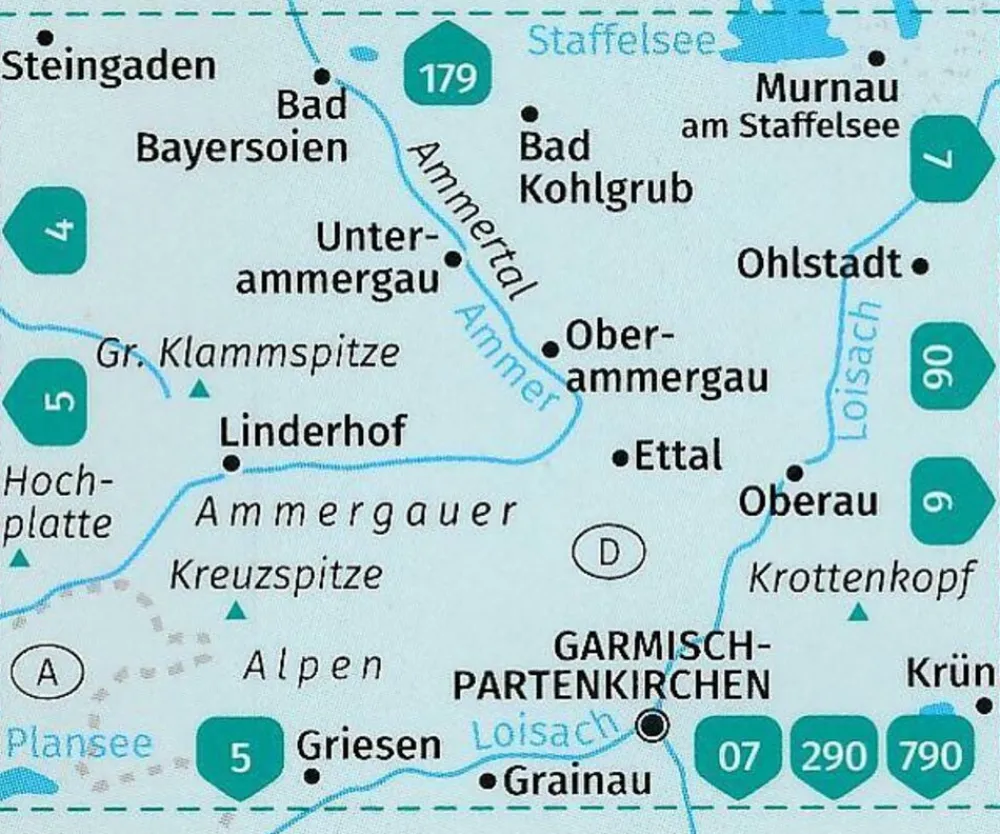 Plaatsen op de kaart: Garmisch-Partenkirchen, Oberau, Estergebirge, Ammergauer Alpen, Oberammergau, Eschenlohe
