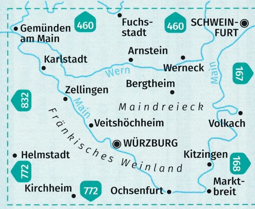 Gemünden am Main, Fuchsstadt, Schweinfurt, Arnstein, Karlstadt, Werneck, Bergtheim, Zellingen, Volkach, Veitshöchheim, Würzburg, Helmstadt, Kitzingen, Kirchheim, Ochsenfurt, Marktbreit