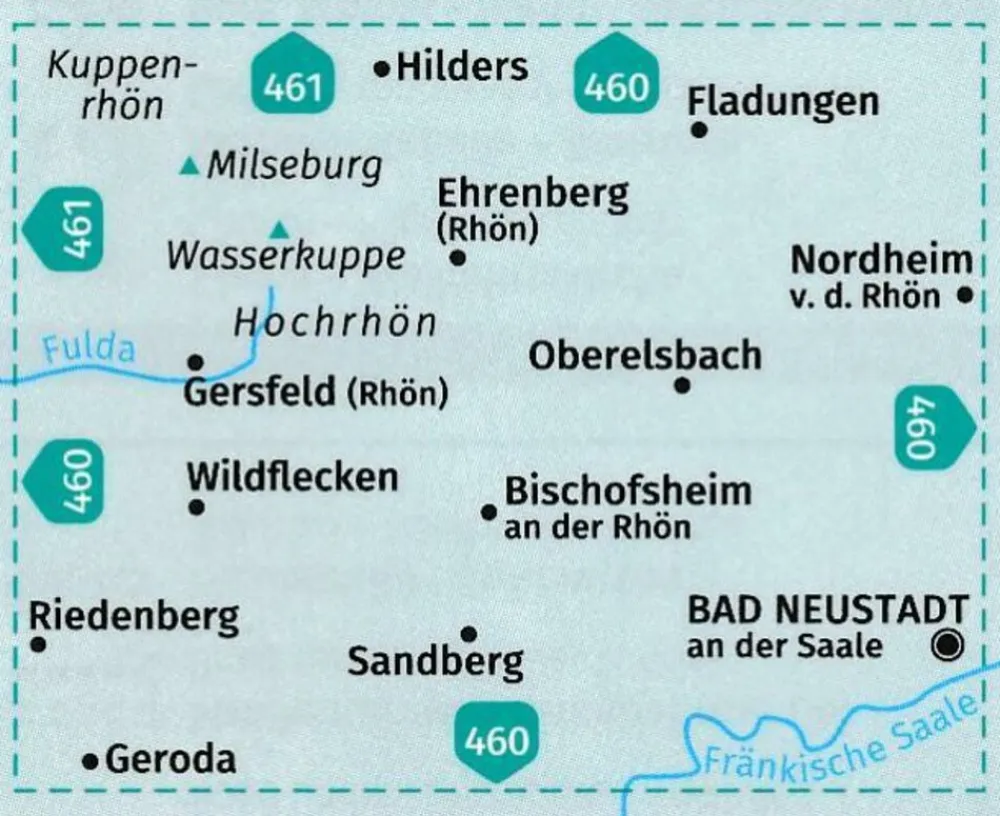 Plaatsen op de kaart: hilders, Fladungen, Milseburg, Gersfeld, Bischofsheim an der Rhön, Bad Neustadt an der Saale, Wildflecken, Sandberg, Riedenberg.