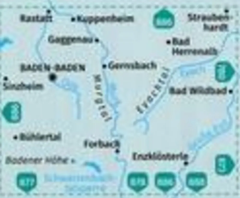 Plaatsen op de kaart: Baden-Baden, Gernsbach, Sinzheim, Bad WiBad Herrenalb, Bad Wildbad, Forbach, Enzklösterle. Kuppenheim.