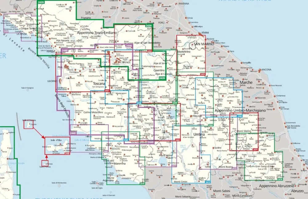 Uitstekende topografische wandelkaart en fietskaart 2469 van de Costa della Maremma aan de Toscaanse kust: met aantal detailkaarten, schaal 1:25.000 als inzetkaart.