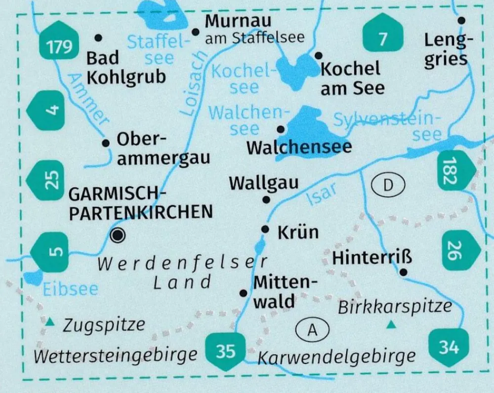 Bad Kohlgrub, Murnau (am Staffelsee), Kochel (am See), Lenggries, Walchensee, Krün, Wallgau, Hinterriß, Mittenwald, Garmisch-Partenkirchen, Oberammergau