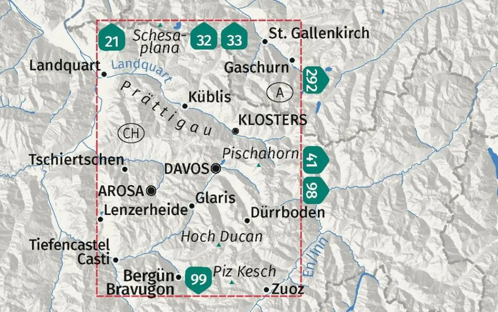 Plaatsen op de kaart: Landquart – St. Gallenkirch – Gaschurn – Davos – Arosa – Lenzerheide – Tiefencastel – Bergün – Zuoz