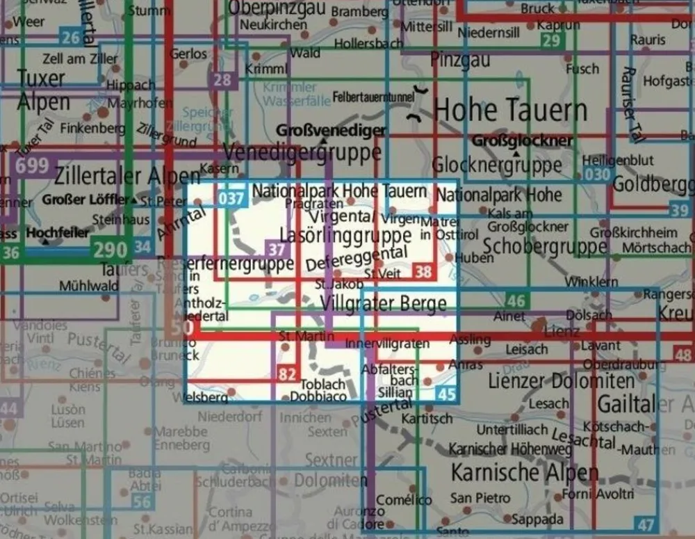 Uitstekende topografische wandelkaart 45 van de regio rondom het Defereggental en het Villgratental: Met aantal detailkaarten, schaal 1:25.000, als inzet.
