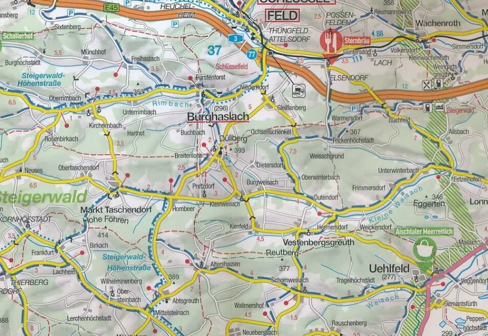 Geplastificeerde, scheurvaste en waterbestendige, toeristische wegenkaart voor de regio, met veel bezienswaardigheden en fiets- en wandelroute’s.
