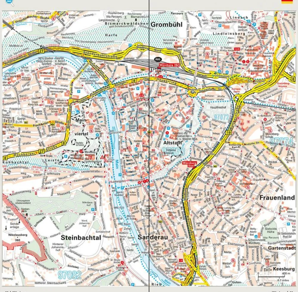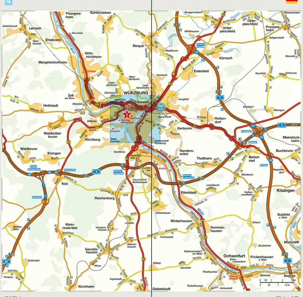 Goede wegenkaart van een deel van Duitsland,met schaal 1:200.000: meer details dan de Michelin wegenkaarten van Duitsland. Deze kaarten hebben een register, een tabel met afstanden tussen steden, enkele centrumkaarten van de meest belangrijke steden, vermelding van o.a. campings aan de hand van symbolen alsmede de bezienswaardigheden. Ook benzinepompen worden bijvoorbeeld vermeld!