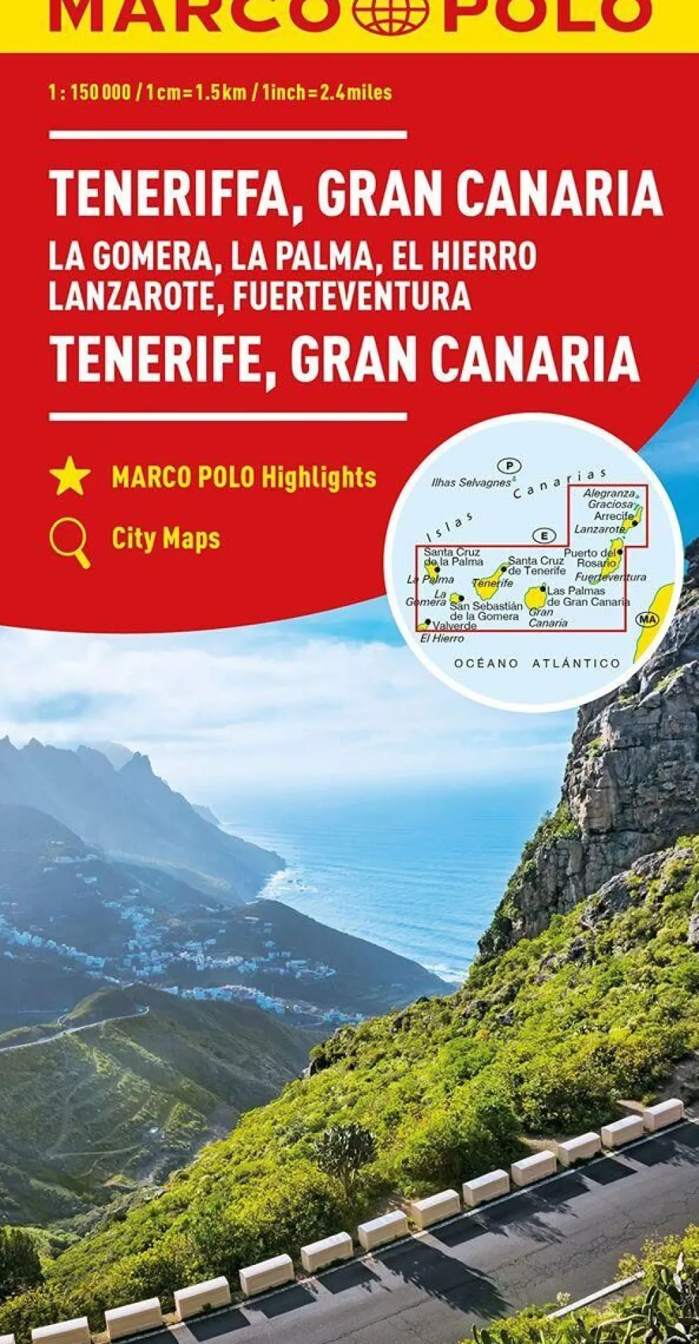 Canary Islands at 1:150,000 on a map from MairDumont with each island presented on a separate panel, plus street plans of central Santa Cruz de Tenerife and Las Palmas de Gran Canaria. A special feature of the “Marco Polo” maps and atlases is a set of seven peel-on/peel-off stickers which can be placed on the maps to help with navigating and removed without damaging the surface.