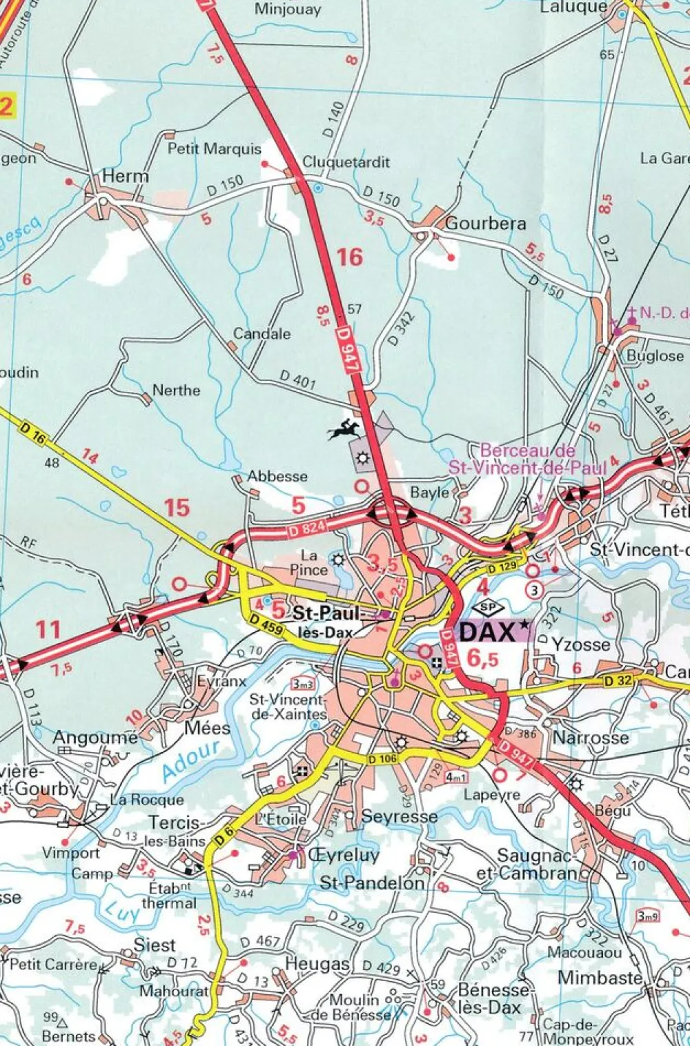 Toeristische wegenkaart Zoom 133 van de Frans-Baskische Kust en het zuiden van Les Landes, het grote bosgebied tussen Bordeaux en de Pyreneeën.bezienswaardigheden en pittoreske routes. Door de schaal ook te gebruiken als fietskaart.