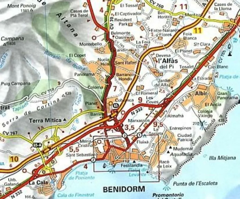 Wegenkaart van de Costa Blanca met de stad Murcia en Alicante. Vanwege de schaal van 1:130.000 goed te gebruiken als fietskaart.