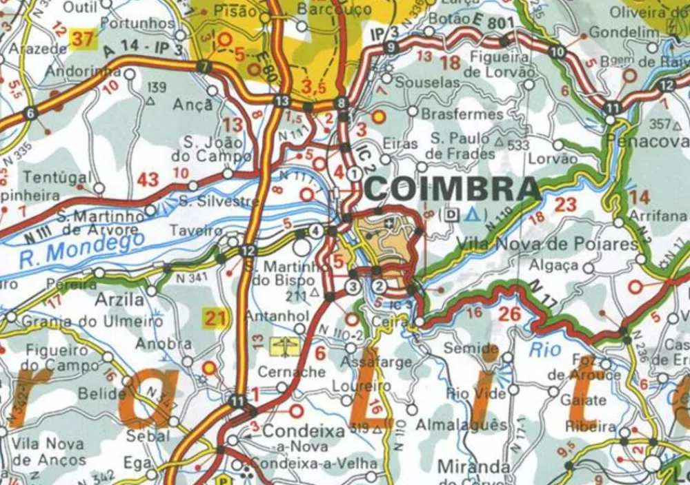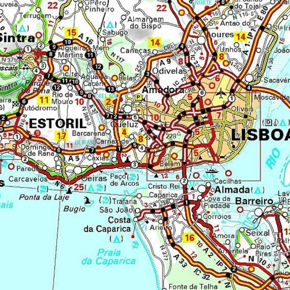 Part of the orange regional series from Michelin, this Portugal Centre map shows this part of Portugal in excellent detail. Primary & secondary road networks are clearly marked out with indications of the number of lanes, intermediate distances and various possible road obstacles or things you should know including steep hills, height limits, toll barriers, prohibited roads and roads subject to restrictions.