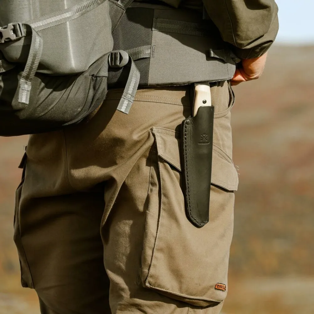 Het sterke handvat van uniek essenhout heeft een vingerbeschermer, een functionele griphak en een 3,2 mm dik, zwart meslemmet van gerecycled Zweeds roestvrij staal. Samen met een speciaal ontworpen bladkromming zorgt dit voor zowel sterkte als stabiliteit bij elke snede. Het mes is ontwikkeld voor veeleisende uitdagingen en heeft voorbeeldige eigenschappen voor degenen die een veilig en robuust gereedschap nodig hebben. De zwarte PC-coating zorgt voor een uitgebalanceerd contrast tussen het heldere essenhout en de glanzende rand van het lemmet. De plantaardig gelooide leren schede is voorzien van een riemlus en beschermt de scherpe rand tegen oppervlakken die het mes bot kunnen maken. Lok is ook compatibel met het accessoire Dangler 10 met knop, waarmee je de afstand tussen de mesfoedraal en de riem kunt vergroten.